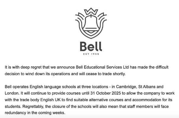 Bell English, the UK-based English language school chain, closed its three London, Cambridge, and St Albans locations on October 31, 2025, due to financial difficulties, including cashflow challenges and the lingering impact of the COVID-19 pandemic. Despite attempts to find a buyer, the schools ceased operations, leading to redundancies for staff and requiring students to find alternative courses. The Swiss branch of Bell remains open and operates independently. Reasons for closure many like cashflow issues, covid impact and inability to find a buyer. Also, Brexit and the fact that the UK is no longer in the Erasmus+ project must have been a nail to the coffin as well.