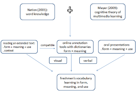 This study is grounded in a conceptual framework derived from Mayer’s (2009) Cognitive Theory of Multimedia Learning (CTML) and Nation’s (2001) model of vocabulary knowledge, as illustrated in Figure 1. The participants acquired vocabulary through three primary activities: reading extended texts, utilizing online annotation tools, and delivering oral presentations. These activities provide both visual and verbal learning inputs that facilitate the acquisition of word knowledge—including word form, meaning, and use—by engaging sensory memory and working memory, and ultimately supporting the consolidation of knowledge into long-term memory.