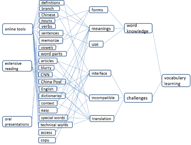 All the data were closely analyzed to identify any emerging themes and patterns, as in Figure 2. Since the data were all processed electronically, the researcher first read through the three major sources (online tools, reading an extended text, and oral presentations), labeled all the codes (i.e., definitions, branch, Chinese) and used consistent themes (i.e., forms, meanings, use). Based on the conceptual framework and research questions, major themes were identified (i.e., word knowledge, challenges) and finally into the overarching issue (i.e., vocabulary learning).