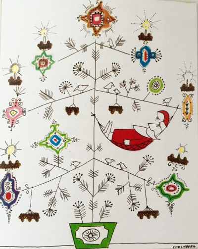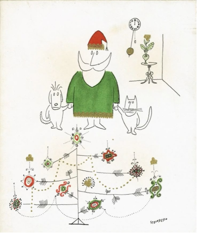 In [his] cards for MoMA, [Steinberg’s] Santa went on to figure-skate, play the violin, surmount a monument, shake hands with his own double, and become one with the Yule tree. Invariably, shod in wingtips, Steinberg’s Santa is your warm, eccentric, infinitely wealthy uncle ― a figure of infantile (meaning perfect) fantasy.”