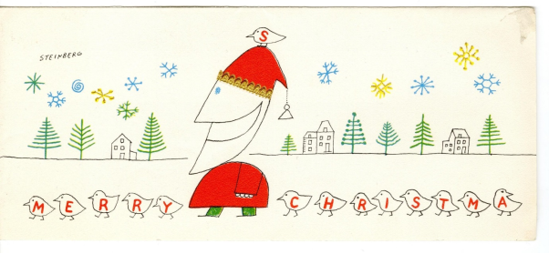 From 1945 to 1951, Saul Steinberg created a series of whimsical black-and-white holiday cards for New York’s Museum of Modern Art. Soon after, in 1952, greeting card giant Hallmark produced a series by famous artists and writers as part of their “Hall of Fame Collection.” The job was a lucrative one for Steinberg, paying $10,000 a year.