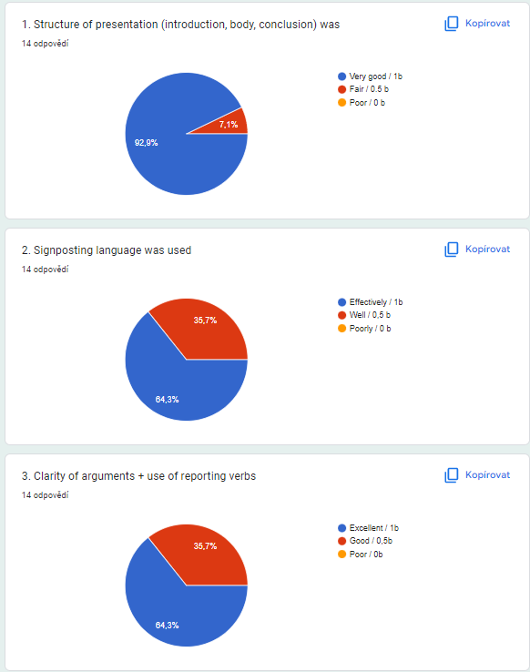 Having received a plethora of peer feedback in different forms while also providing the same feedback to their peers, students became closely familiar with the assessment criteria and exam presentation requirements and expectations and thus better prepared for their exam presentations. For the remainder of the semester, students delivered their exam presentations in class while being assessed jointly by the teacher and peers who were present in class on the day of their presentation. For this in-class assessment, the students and the teacher used the Google evaluation forms in the same way as during online classes.
