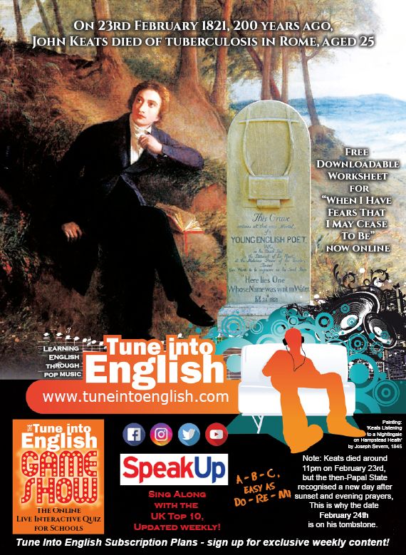 The 23rd February is the 200th anniversary of the death of English Romantic Poet John Keats. ELT guru Roy Boardman has prepared a worksheet on Keats’ sonnet which explores the fear of death, based on a musical version by John Webster.