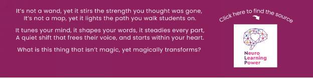 During my time battling burnout my intention to grow back to healthy resilience directed my attention to NLP. Neuro-Linguistic Programming is a framework that studies the relationship between language, perception, and behaviour. At its core, it explores how the patterns of thought and communication we use shape the way we experience the world and respond to challenges. In education, NLP provides practical tools for self-awareness, emotional regulation, motivation, and communication - enabling teachers to manage their inner state, connect more effectively with learners, and create environments of safety and engagement (Gray, 2019; Kotera & Sheffield, 2020).