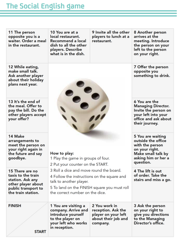 To finish off with, here’s a board game for practising language in social situations. Make one copy of the photocopiable board below for pairs of students or groups of three. They will need a dice and each player needs a counter (a coin, for example) and places it on the START square. They take turns to roll the dice and move their counter round the board. As they land on each square, they follow the instructions and practise speaking in a range of social situations.