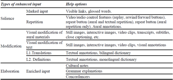 In CALL materials' design, help options are considered a means for attaining comprehensible input as they provide just-in-time assistance in cases of comprehension breakdowns (Chapelle, 2005; Grgurovic´ and Hegelheimer, 2007; Cárdenas-Claros and Gruba, 2012). Learners' comprehension, therefore, is expected to increase through the different types of input enhancements offered by help options (see Figure 3 below).
