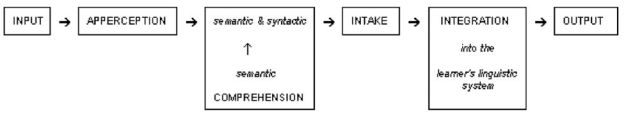 This model is shaped by three key components: 1) the characteristics of the received input based on Krashen's (1982) theory of comprehensible input and Schmidt's (1990) Noticing Hypothesis, 2) the opportunities for modified interaction and negotiation of meaning highlighted by the works of Long(1983) and Pica (1994) and 3) the opportunities given to learners to notice the gap between their language output and the target forms advocated by Swain and Lapkin's (1995) Comprehensible Output. According to this model, learners should be exposed to comprehensible input that is 1) slightly beyond learners' proficiency level and 2) consciously attract learners' attention to certain features. This comprehensible input can become intake after being comprehended through semantic and syntactic processing. The intake can in turn be integrated into learners' linguistic repertoire whose development can be evaluated based on learners' output.