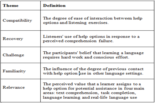 A prominent attempt that sought a comprehensive analysis explaining the factors promoting or impeding learners' interaction with help options in a multimedia-based listening was conducted by Cárdenas-Claros and Gruba (2012). Based on a cyclical analysis of the quantitative and qualitative data collected from screen capture software, questionnaire, interviews and observations, five themes were identified as responsible factors regulating learners' use/non-use of help options. These themes were Compatibility, Recovery, Challenge, Familiarity, and Relevance (see Figure 1 below).