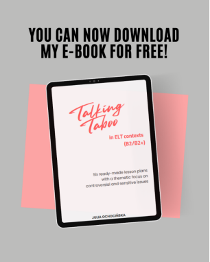 And while navigating tough conversations in the classroom is one thing, there’s no denying how big of a role the selection of appropriate (and what I mean here is thought-challenging but in no way offensive) resources plays in this process. That materials-seeking journey combined with my students’ strive and openness for having meaningful talks were the main motivations behind creating “Talking Taboo in ELT contexts” – an e-book designed specifically to address a wide range of the so-called contemporary controversies  or in other words – topics which are rather pressing from a contemporary perspective, such as immigration, disability, sexuality, gender roles, female empowerment and reproductive freedom. In terms of structure, this resource is a compilation of six ready-made lesson plans aimed to develop critical literacy and encourage a culture of mutual respect of varying opinions in the classroom by engaging your learners with a plethora of stimulating tasks and activities based on authentic resources (e.g. articles, videos, photos) and thought-provoking topics which may serve as a starting point for meaningful in-class debates and discussions. In addition to various speaking components, each chapter includes a vocabulary expanding task corresponding thematically with the central idea of a given unit. As far as the target audience is concerned, because of its subject matter, this e-book is the most suitable for young adults/adults who demonstrate higher levels of proficiency (upper-intermediate to advanced). It’s intended primarily for small group instruction, both in online or offline settings.